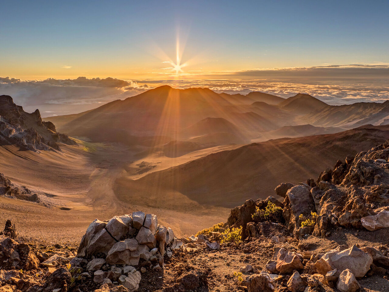 霧に包まれたハレアカラ山の景色は本当に神々しいもので、朝日が昇る瞬間はまさに感動的です。