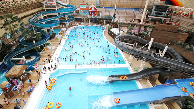 巨大な室内プールで、流れるプール・スライダー・キッズエリアが充実。
